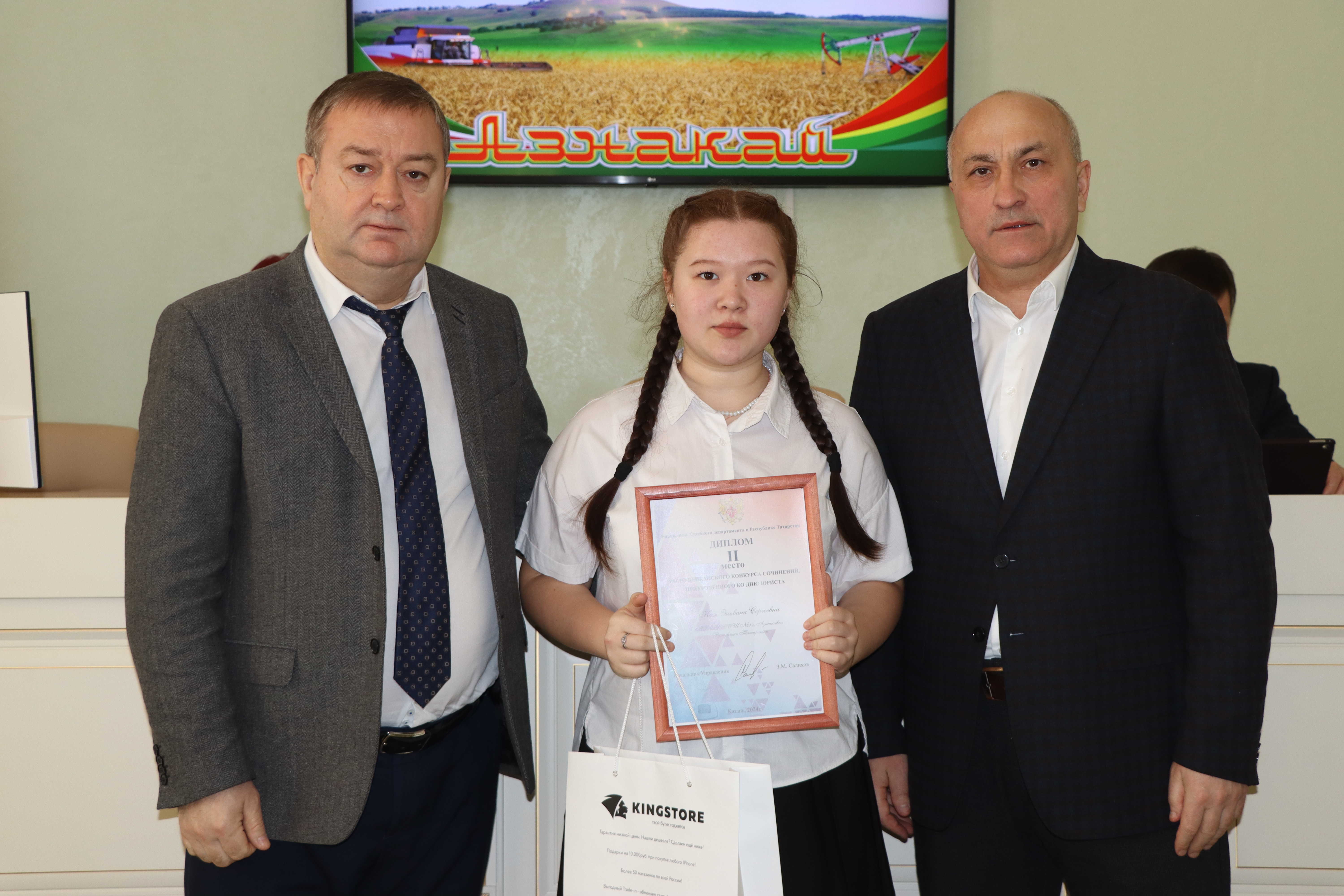 На районном совещании с участием председателя Азнакаевского городского суда Ильдара Шарифуллина, Главы района Марселя Шайдуллина, начальника Управления образования Зульфии Султангировой, педагогов школ, руководителей организаций и учреждений состоялось торжественное награждение Эльвины Ким - ученицы 9 класса МБОУ «СОШ № 1 г. Азнакаево», занявшей II призовое место в республиканском конкурсе сочинений на правовые темы, проводимой Управлением Судебного департамента в Республике Татарстан в рамках проекта «Правосудие: от А до Я». Руководитель суда и Глава района вручили ей Диплом победителя и памятный подарок, высказали теплые слова поздравлений с заслуженной наградой, пожелали дальнейших творческих побед и высот!