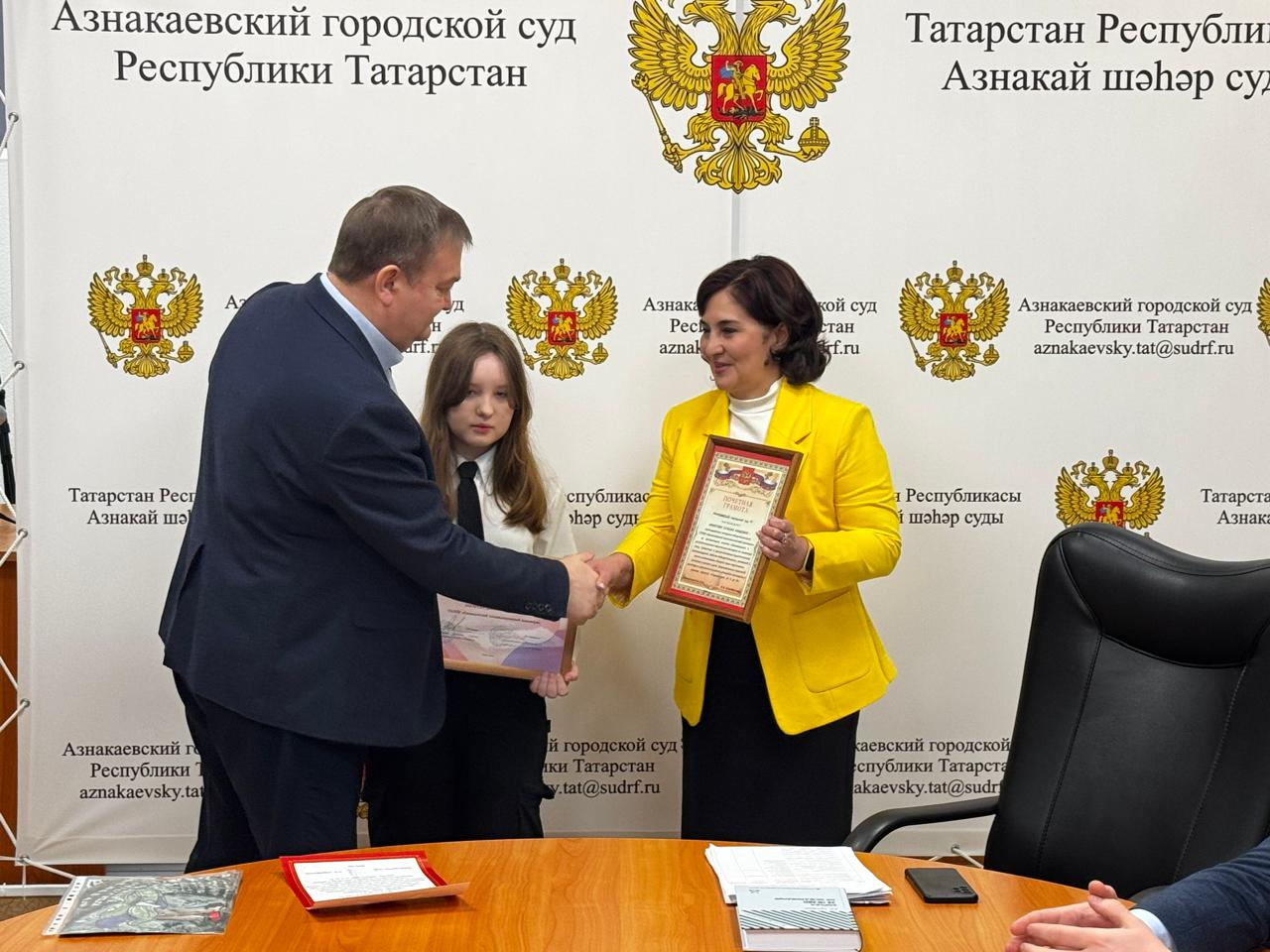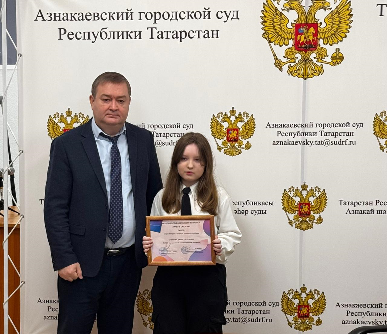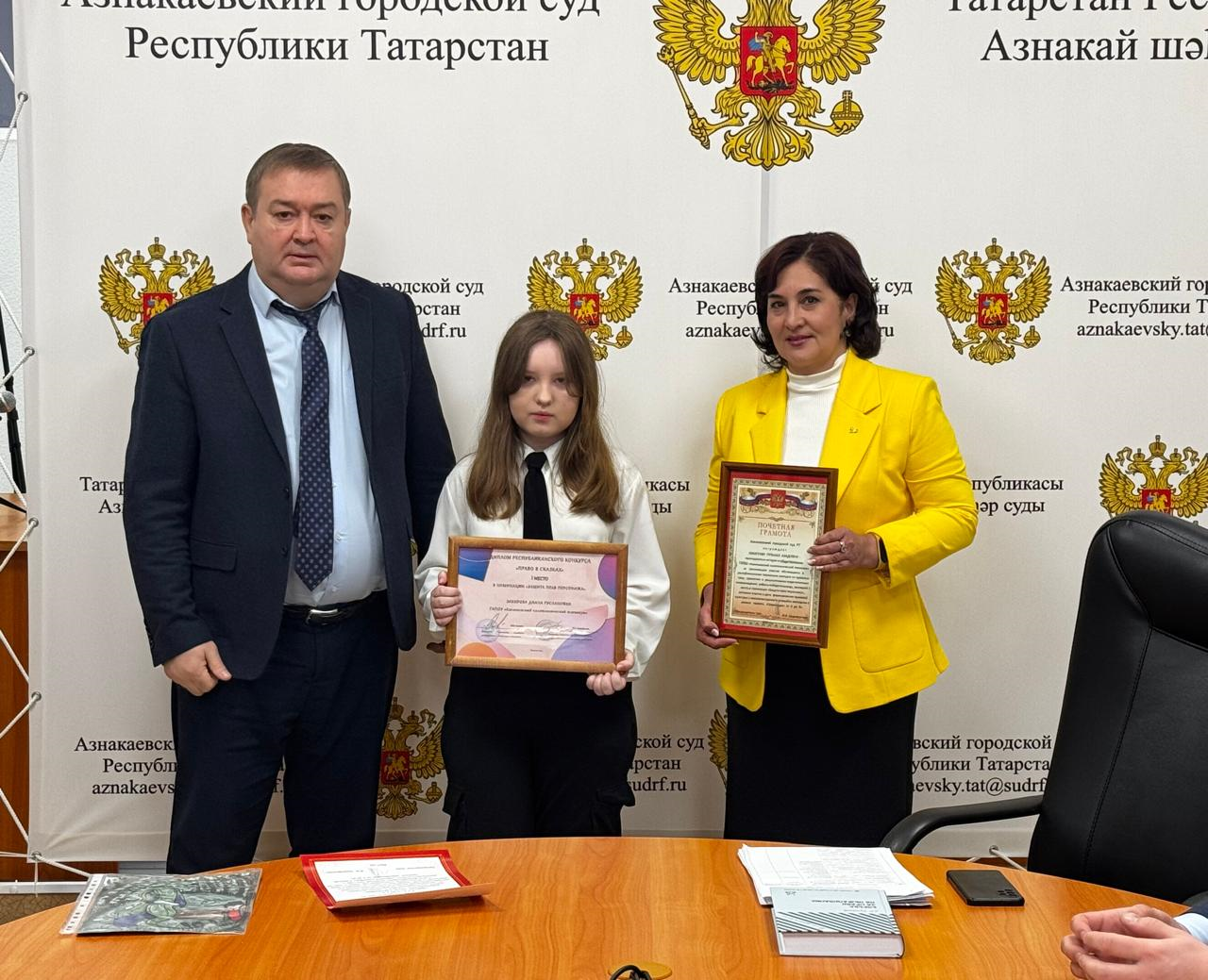 В городском суде состоялась церемония торжественного награждения победительницы республиканского творческого конкурса «Право в сказках» Закировой Дианы - учащейся первого курса Азнакаевского политехнического техникума, занявшей 1 место в номинации «Защита прав персонажей» и её педагога – куратора Ахметовой Гульназ Азадовны Председатель суда Ильдар Ирекович Шарифуллин поздравил приглашенных гостей с победой, вручил Диплом Управления Судебного департамента в Республике Татарстан Диане Закировой и Благодарственное письмо Азнакаевского городского суда педагогу Гульназ Ахметовой и пожелал дальнейших творческих успехов и побед! ![]() ![]() ![]() Пресс-центр суда |